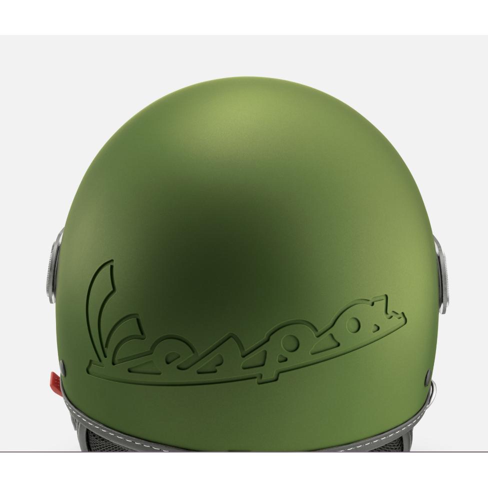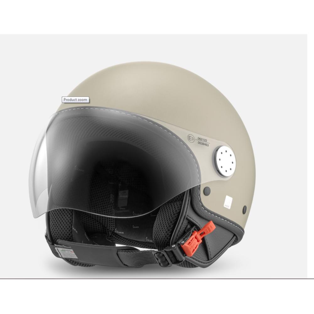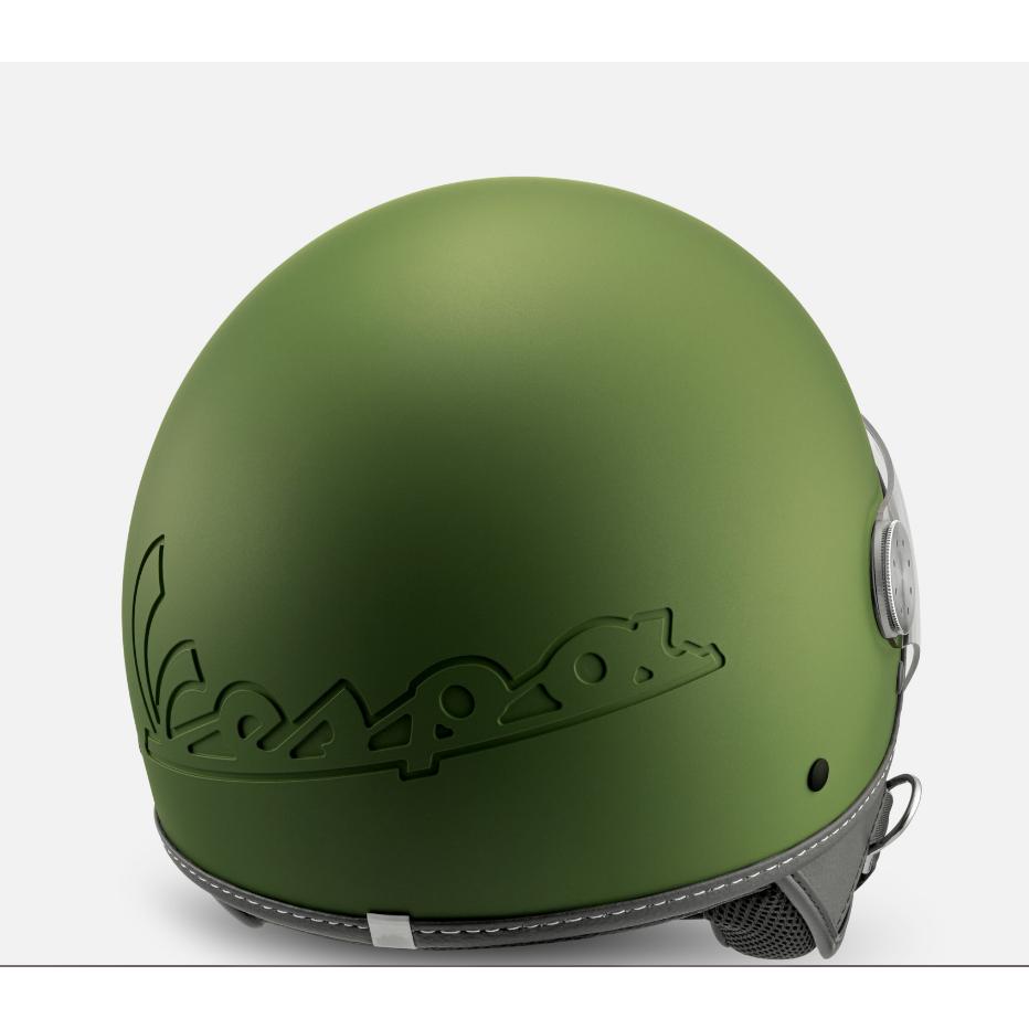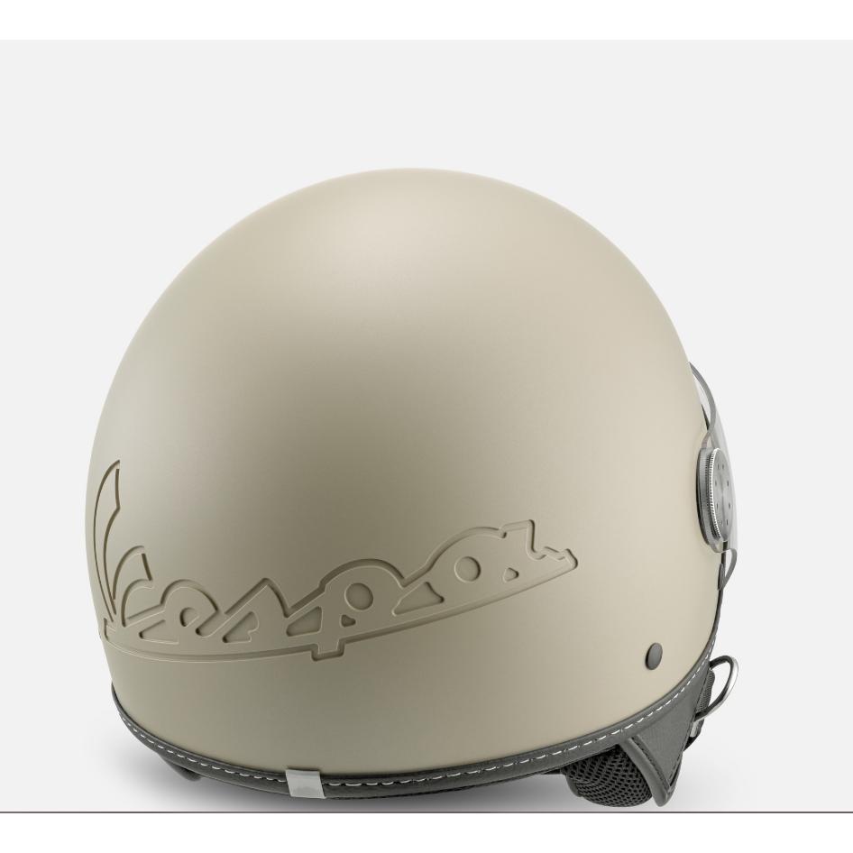 Κράνος demi-jet κατασκευασμένο από υλικό ABS με φινίρισμα από οικολογικό δέρμα στο κέλυφος. Διαφανής ζελατίνα 2 χιλιοστών με αντιχαρακτική επεξεργασία και αγκράφες αλουμινίου. Χαραγμένο λογότυπο Vespa σε ασορτί χρώμα στο πίσω κέλυφος. Μικρομετρικό σύστημα συγκράτησης με αντικλεπτικό δακτύλιο. Καινοτόμο αναπνεύσιμο εσωτερικό από τρισδιάστατο ύφασμα. Εσωτερική επένδυση: πλενόμενη και αφαιρούμενη. Πιστοποίηση ECE 22.06. Κατασκευασμένο στην ΙΤΑΛΙΑ.