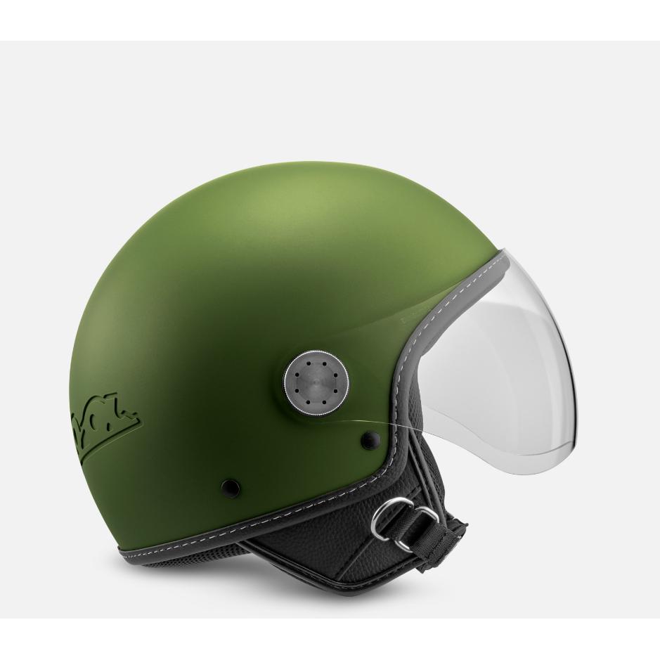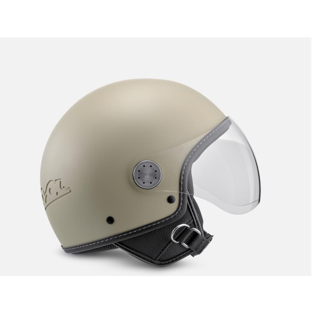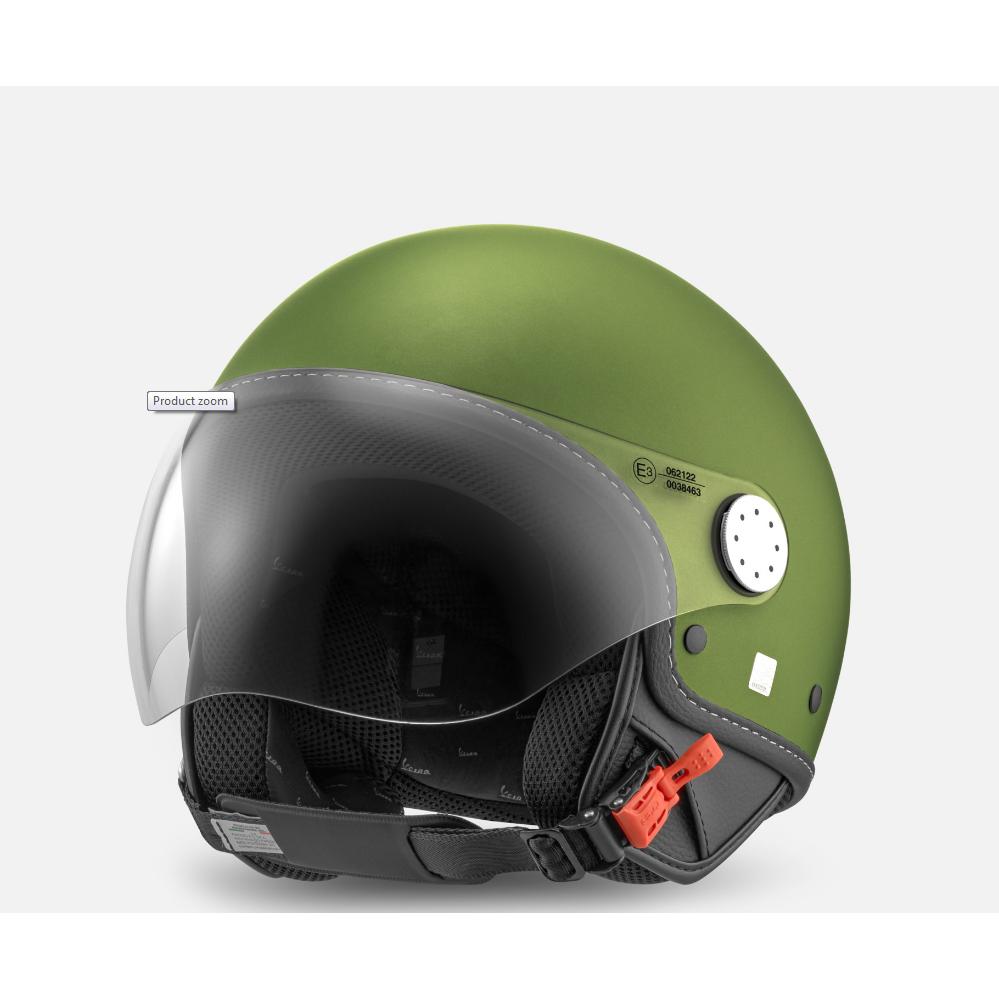 Κράνος demi-jet κατασκευασμένο από υλικό ABS με φινίρισμα από οικολογικό δέρμα στο κέλυφος. Διαφανής ζελατίνα 2 χιλιοστών με αντιχαρακτική επεξεργασία και αγκράφες αλουμινίου. Χαραγμένο λογότυπο Vespa σε ασορτί χρώμα στο πίσω κέλυφος. Μικρομετρικό σύστημα συγκράτησης με αντικλεπτικό δακτύλιο. Καινοτόμο αναπνεύσιμο εσωτερικό από τρισδιάστατο ύφασμα. Εσωτερική επένδυση: πλενόμενη και αφαιρούμενη. Πιστοποίηση ECE 22.06. Κατασκευασμένο στην ΙΤΑΛΙΑ.