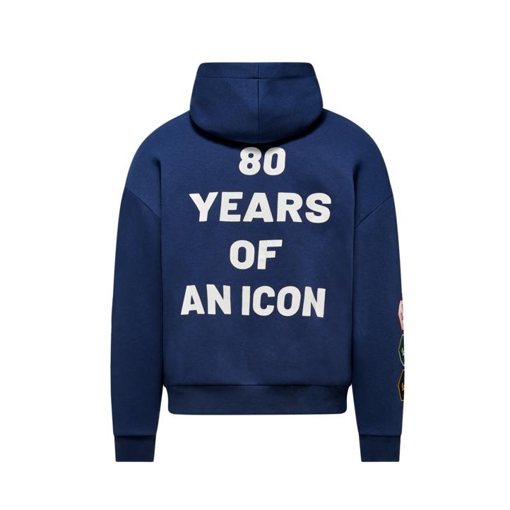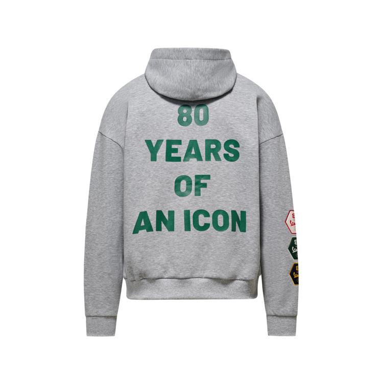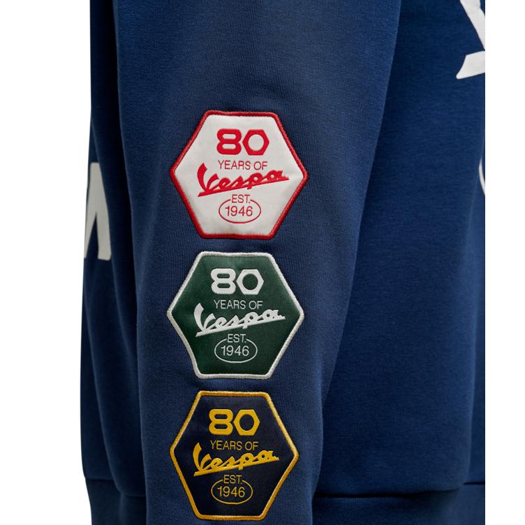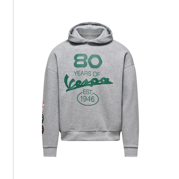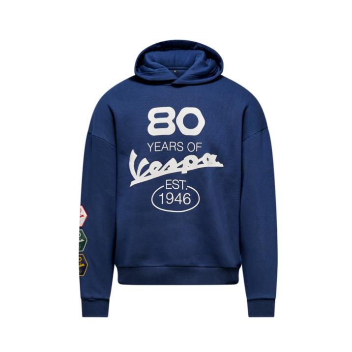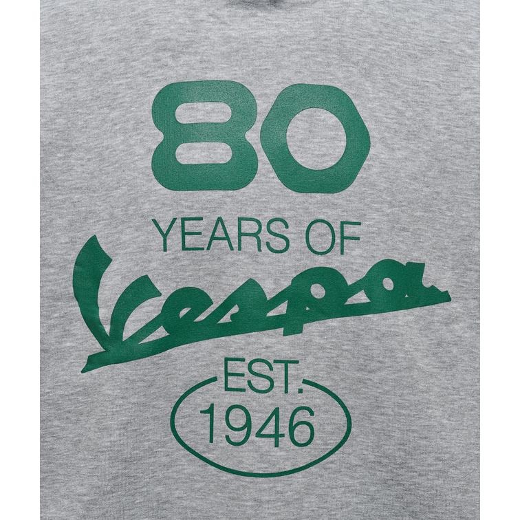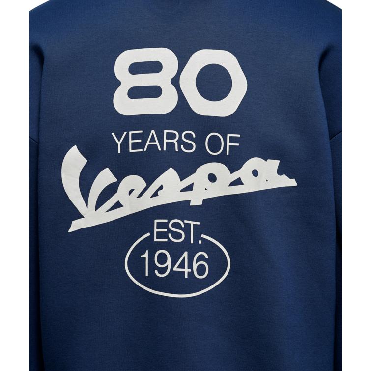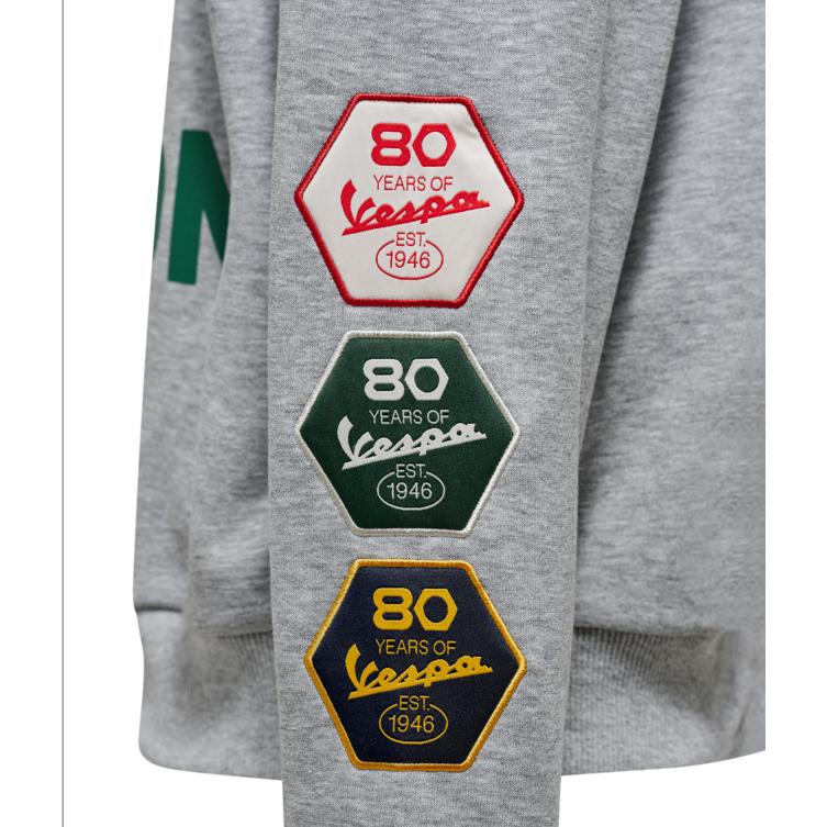 Αυτό το αναμνηστικό φούτερ με κουκούλα γιορτάζει την 80ή επέτειο της Vespa με ένα τολμηρό σχέδιο εμπνευσμένο από την κληρονομιά. Διατίθεται σε σκούρο μπλε και γκρι μελανζέ, διαθέτει κλασική σιλουέτα με κουκούλα με ριμπ μανσέτες και στρίφωμα για άνετη εφαρμογή. Το μπροστινό μέρος αναδεικνύει το γραφικό «80 Χρόνια Vespa – Ιδρύθηκε το 1946» σε μια εκτύπωση με αντίθεση, ενώ το πίσω μέρος τονίζει τη δήλωση «80 Χρόνια ενός Εμβλήματος». Κάθε χρωματικός συνδυασμός περιλαμβάνει ασορτί επετειακά σήματα που ενισχύουν τη συλλεκτική φύση του κομματιού. Ένα ευέλικτο και διαχρονικό φούτερ με κουκούλα που ενσαρκώνει την κληρονομιά της Vespa μέσα από καθαρές γραμμές, εμβληματικό branding και καθημερινή άνεση.